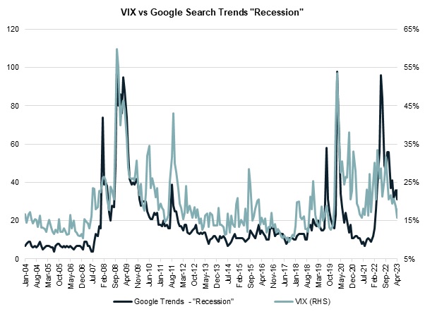 At the same time, the frequency of Google search queries for the term ‘recession’ has declined. While many fund managers and macro strategists remain concerned about the future trajectory of the global economy, option buyers and Google searchers seem to be becoming less worried.