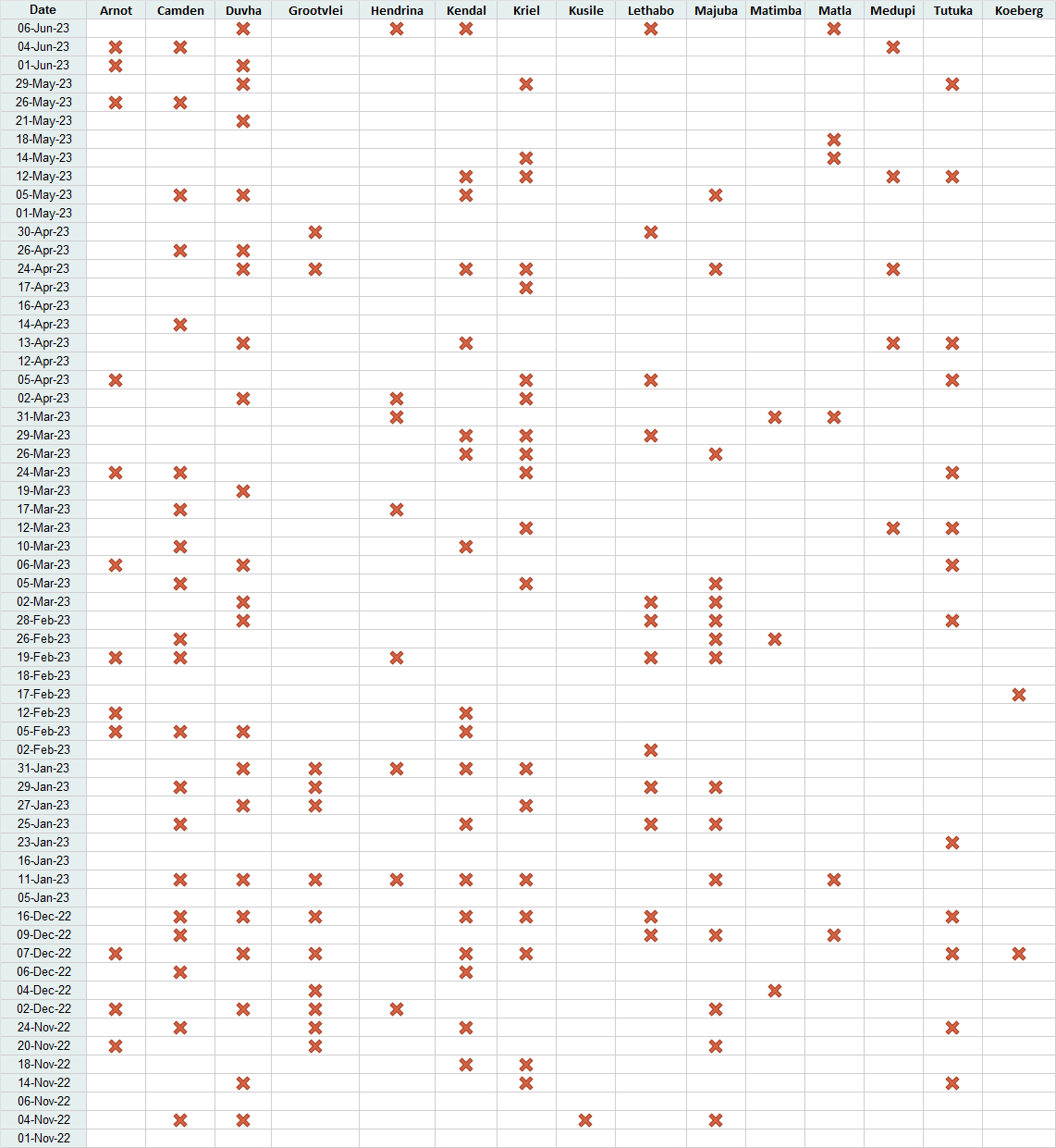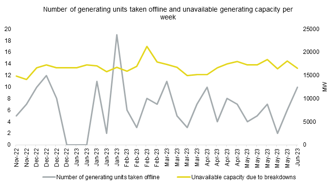 We have compiled the above data using Eskom’s media releases over the period from November 1, 2022, to June 6, 2023. It is not clear whether the disclosure only captures units taken offline due to breakdowns or also captures planned maintenance. It is also not clear whether the disclosure captures all instances of units being taken offline or if there are some instances of double counting. The analysis above represents our best effort to capture the data accurately.