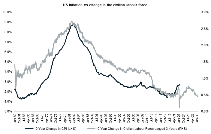 As populations age and population growth slows, demographics are set to have a large impact on economic and market outcomes. Historically, there seems to be evidence that the growth in the working-age population has been correlated with inflation levels. Below, we show the rolling 10-year change in US CPI against the rolling 10-year change in the civilian labour force, lagged by 3 years.