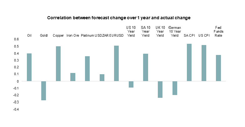 We assess consensus forecasts for 14 macro-economic variables across commodities, currencies, bond yields, inflation, and short rates, 11 of which are investable. We look at two different measures over the period from 2007 to 2023. First, we consider directional accuracy by measuring the correlation between the forecast change in a variable over the next year and the actual change that happened. An accurate forecast should be positively correlated with subsequent changes in the variable that it is trying to forecast.