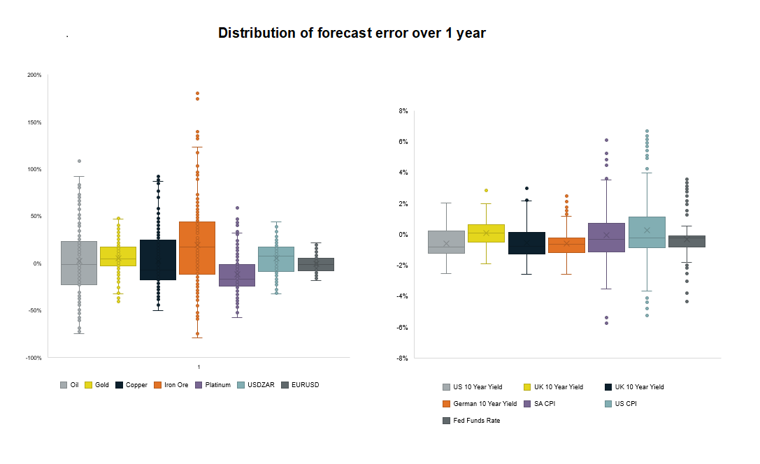 2For Commodities and currencies we calculate error as the forecast error as a percentage of the market price at forecast date. For yields, CPI and rates we calculate as difference between forecast and the actual.