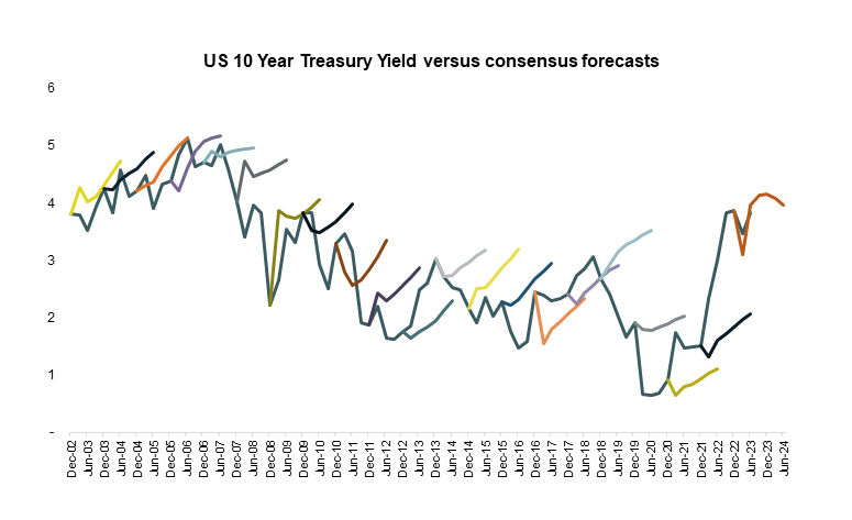 You may have seen a chart similar to the one below, showing the point-in-time forecasts of the US 10-Year Treasury Yield for the next six quarters against the actual trajectory of the yield. While this type of chart is often cited to show the persistent error and bias in some macro forecasts, we think that the question warrants some more analysis.