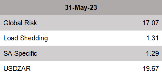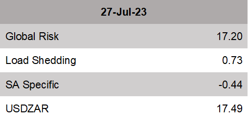 Comparing this to the end of May shows how load shedding risk has reduced and other SA-specific risk has now swung negative. The ZAR is now outperforming its Emerging Market counterparts, given our current level of load shedding.