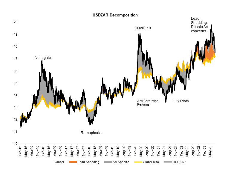 Here the yellow line is the component of the USDZAR that can be explained by global factors, the orange area is the impact of load shedding, and the grey, is the residual that must be explained by other SA-specific risks. As a check of this model, we have highlighted periods of large positive and negative SA-specific risks that seem to correlate well with material news events at the time.