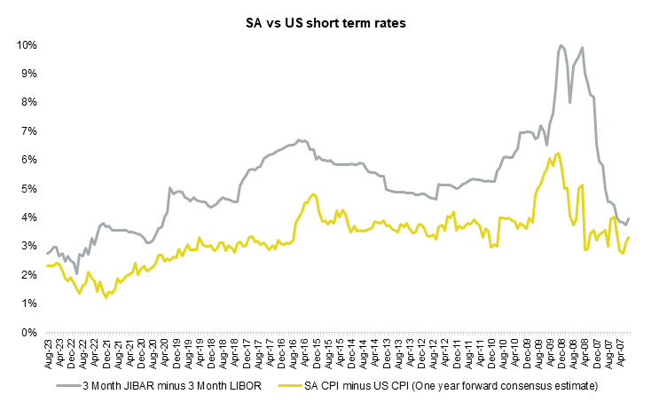 One thing that we think may keep the MPC on the hawkish side is the differential between SA and US short rates. Below, we show the difference between 3-month JIBAR and 3-month LIBOR over the past 15 years, as well as the difference in 1 year forecast inflation.