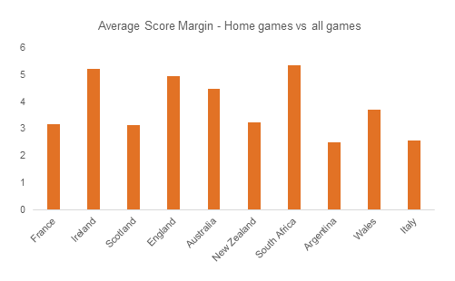 From the chart above, we can see that France hasn’t had a particularly strong home ground advantage, and in fact, it is our own South African fans who seem to give the Springboks the biggest boost when playing in front of a home crowd. Hard data proving that Springbok fans have the most gees!