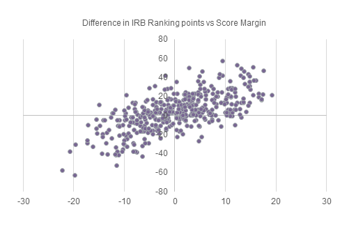 And so, the habit bleeds into other domains. We have gathered the IRB world rankings on a weekly basis over the past 5 years, and for each match in our dataset over that period, we compared the ranking of the two teams prior to the match to the resulting score margin. As the chart below shows, there is a very positive correlation.
