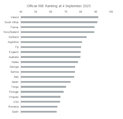 This year’s tournament certainly feels like one of the most open and competitive World Cups in recent memory, with any of the top four ranked teams—Ireland, France, South Africa, and New Zealand—having a good chance of prevailing. Below are the official IRB ranking points for the top 20 teams in the world prior to the start of the competition, with only 2.76 ranking points separating the 1st and 4th ranked teams.