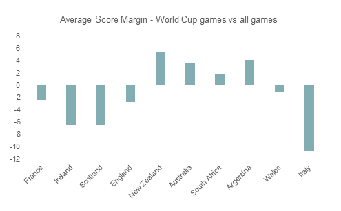 We also ask the question of which teams do particularly well at World Cups relative to their performance in other matches. Unsurprisingly, the All Blacks have historically shown up well at World Cups, along with Australia, Argentina, and South Africa.