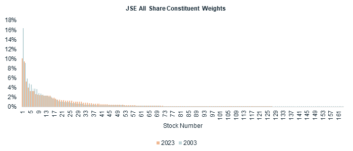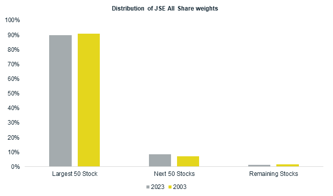 The 50 largest stocks made up 91% of the All Share 20 years ago, and they make up 90% today. The share of the index outside of the largest 100 counters has only declined from 1.8% to 1.4%.