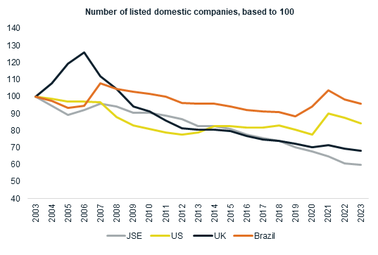 The shrinking number of listings is a global phenomenon, although it is very pronounced in SA. Over the past 20 years, based on data from the World Bank and the World Federation of Exchanges, the number of domestic stocks listed in the USA, UK, Brazil, and South Africa has all declined. Over this period, South Africa has seen the largest decline, and the past three years seem to have seen this trend reverse in other parts of the world; this has not been the case on the JSE.
