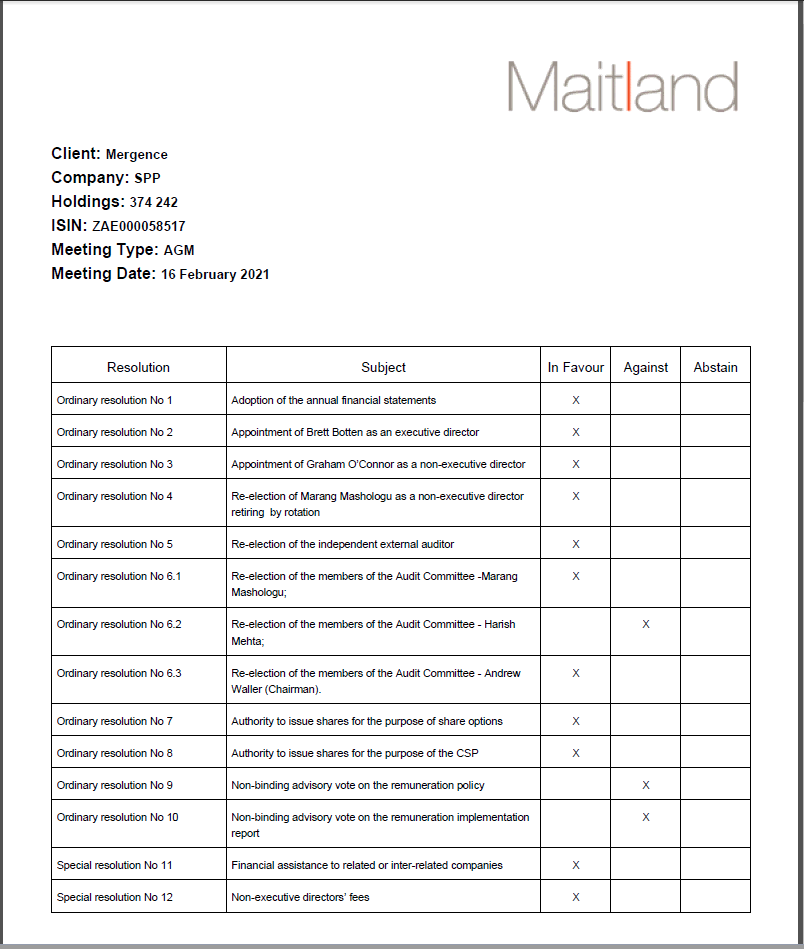 Legal compliance is also outsourced. Ongoing external compliance is outsourced to Compli-Serve SA. Compli-Serve SA is a leading independent specialist provider of advisory and operational compliance services to the financial services sector. Internally, the compliance administrator is accountable for compliance. Regular communication with the Central Bank of Lesotho ensures that Mergence is up to date with the latest regulatory changes and complies with the necessary requirements.